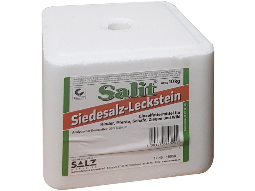 Kamenná soľ pre zvieratá. Určená pre hovädzí dobytok, kone, ovce, kozy a divú zver. Kamenná soľ pre zvieratá. Určená pre hovädzí dobytok, kone, ovce, kozy a divú zver. Zloženie: 39 % sodík Rozmery: 180 x 180 x 175 mm Otvor: Ø 28,5 mm Hmotnosť: 10 kg Tento produkt môže byť použitý v ekologicko / biologickej produkcii v súlade s vyhláškami (EG) č. 834/2007 a (EG) č. 889/2008a, obsahuje 0,0% (TS) produktov z ekologického poľnohospodárstva, 0,0% (TS) konverzných produktov, 100,0% (TS) ostatných výrobkov, 0,0% (TS) výrobkov poľnohospodárskeho pôvodu. Vyrobené podľa špecifikácií Bioland e.V., kontrolované Kiwa BCS Oko-Garantie GmbH Nürnberg.Dodatočné parametre