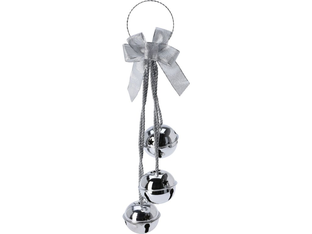 Elegantná vianočná dekorácia Zvončeky na dvere v striebornej farbe dodá vášmu domovu sviatočný pôvab a decentný lesk. Tri kovové zvončeky zavesené na ozdobnej šnúrke a doplnené mašľou vytvárajú harmonický a vkusný doplnok, ktorý privíta vašich hostí jemným cinkaním.
