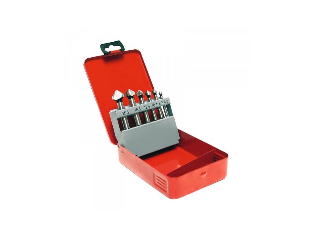 6-dielna sada profesionálnych kužeľových záhlbníkov HSS 6,3 - 20,5 mm, v praktickom pevnom kovovom boxe. Univerzálne využitie v dielni, v domácnosti, hobby a pod. Ideálne pre zahĺbenie pre kužeľové hlavy skrutiek, zahĺbenie a odihlenie otvorov. Vybavenie: