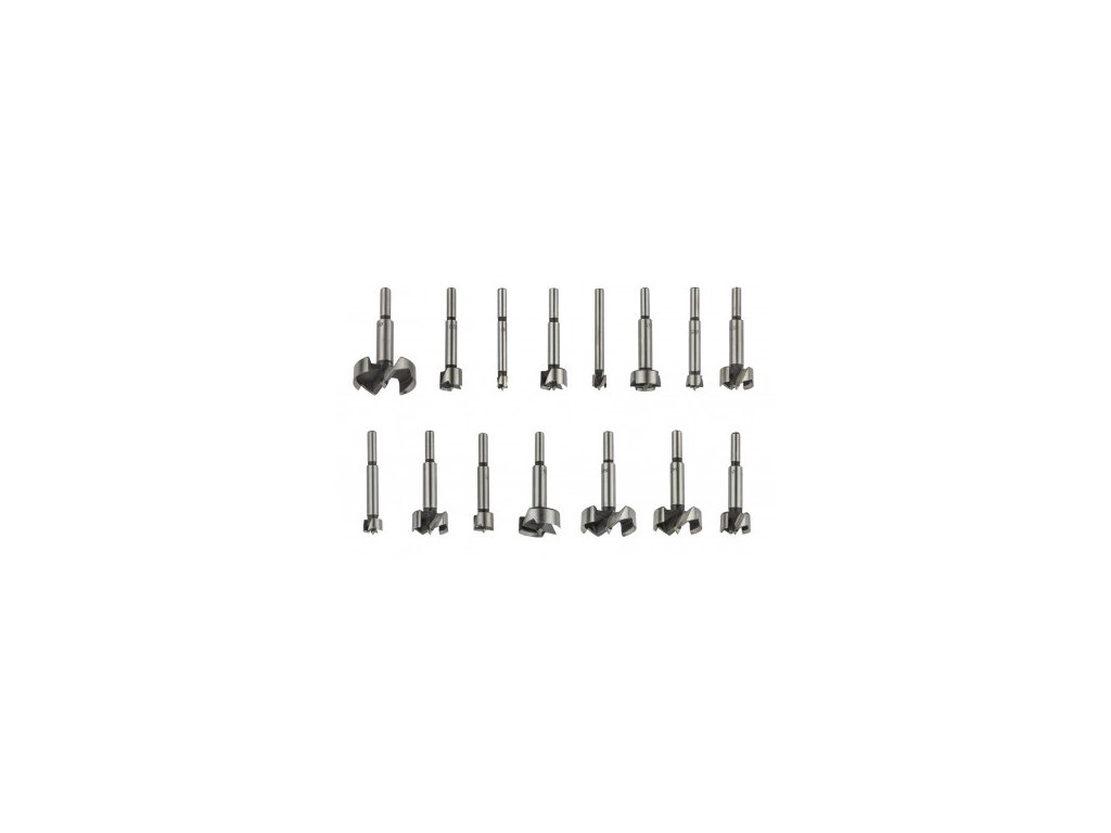 Vrtáky na vŕtanie do dreva z nástrojovej ocele s centrovacím hrotom. Možno použiť aj v menších vŕtačkách a akumulátorových skrutkovačoch. V drevenom boxe. Sukovníky / Forstnerove vrtáky do dreva, 15-dielna sada