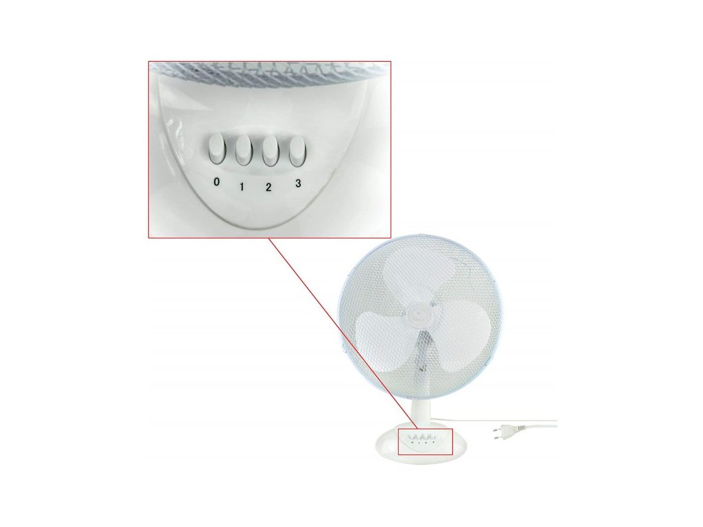 Stolový ventilátor so širokou základňou. Horizontálna oscilácia, nízka hlučnosť a pevný stojan. Sklon je individuálne nastaviteľný, tri rýchlostné stupne.