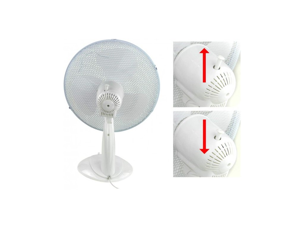Stolový ventilátor so širokou základňou. Horizontálna oscilácia, nízka hlučnosť a pevný stojan. Sklon je individuálne nastaviteľný, tri rýchlostné stupne. Stolový ventilátor 34 cm 45 W