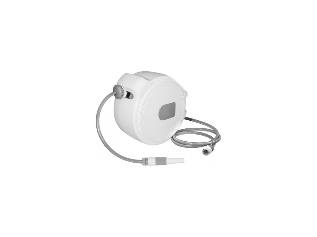 Automatický bubon s hadicou 30 m s výpletom, rukoväť, 2 rýchlospojky, pripojovací kus pre rýchlospojku pre 3/4" IG / 1/2" IG, tryska, držiak na stenu s kotviacim materiálom, automatika navíjania s vedením - vďaka tomu sa hadica navíja po vrstvách, bubon zastane po každej ½ otáčke, stop vťahovania. Pracovná hadica: 30 m