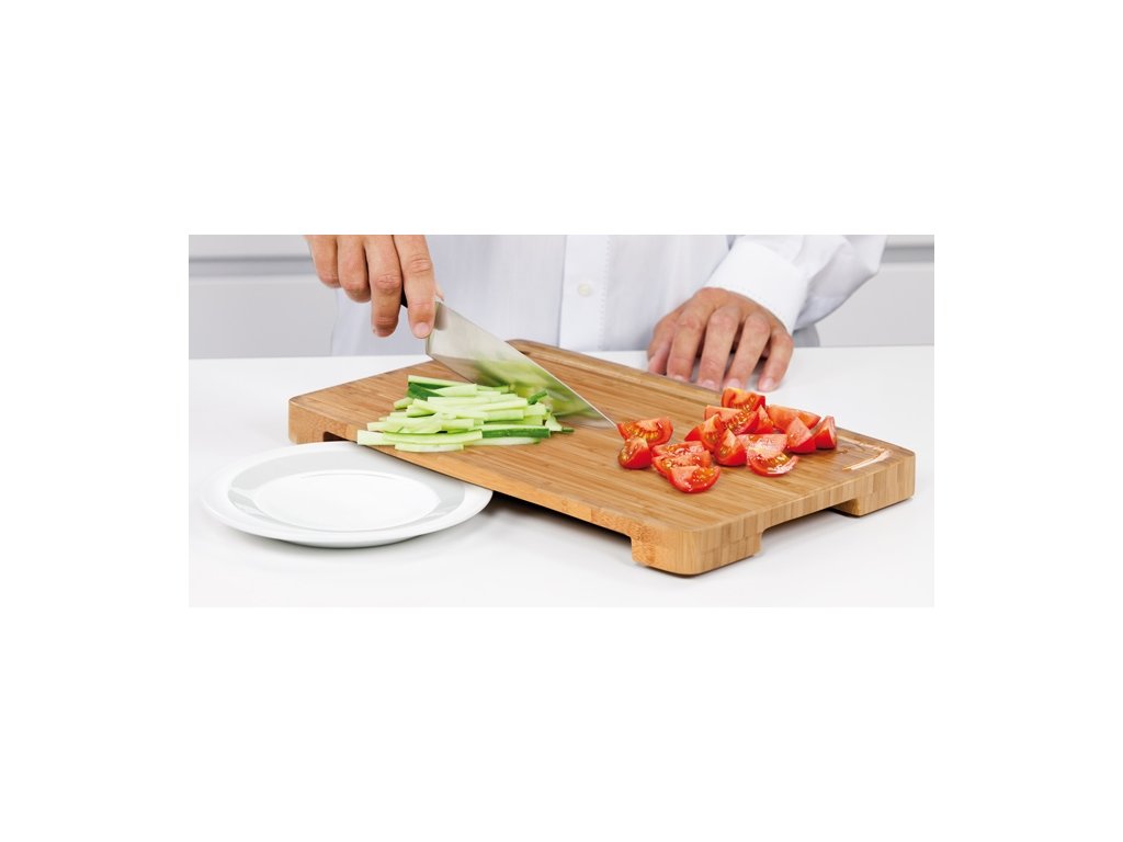 Masívna krájacia doska zo špeciálne vrstveného prírodného bambusu vynikajúca na krájanie, porciovanie a vyklepávanie potravín. Vybratie na spodnej strane dosky umožňuje zasunutie taniera alebo podnosu pre ľahké zhrnutie naporciovaných surovín, krájacia doska je spádovaná smerom ku žliabku pre zachytávanie tekutín. Vybavená komfortnými úchytkami pre bezpečnú manipuláciu a protišmykovou úpravou. Čistite pod tečúcou vodou, neumývajte v umývačke. 5 rokov záruka