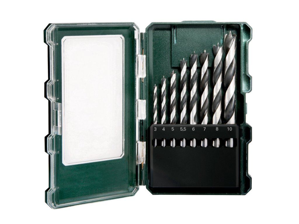 - 8-dielna súprava v kvalitnej, robustnej plastovej kazete so špeciálnym dizajnom Metabo a s výsuvným vešiakom s euro-otvorom; špirálový vrták na drevo z kvalitnej chromovanej vanadiovej ocele, tvrdený, s centrovacím hrotom pre použitie do tvrdého a mäkkého dreva, preglejky, upínacích platní a pod.