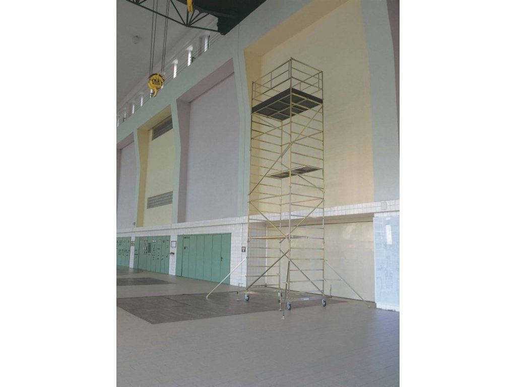 Oceľové pojazdné lešenie so šírkou podlahy 1,36 m a maximálnou výškou umiestnenia podlahy 6,30 m. Na lešení môže pracovať len jedna osoba.