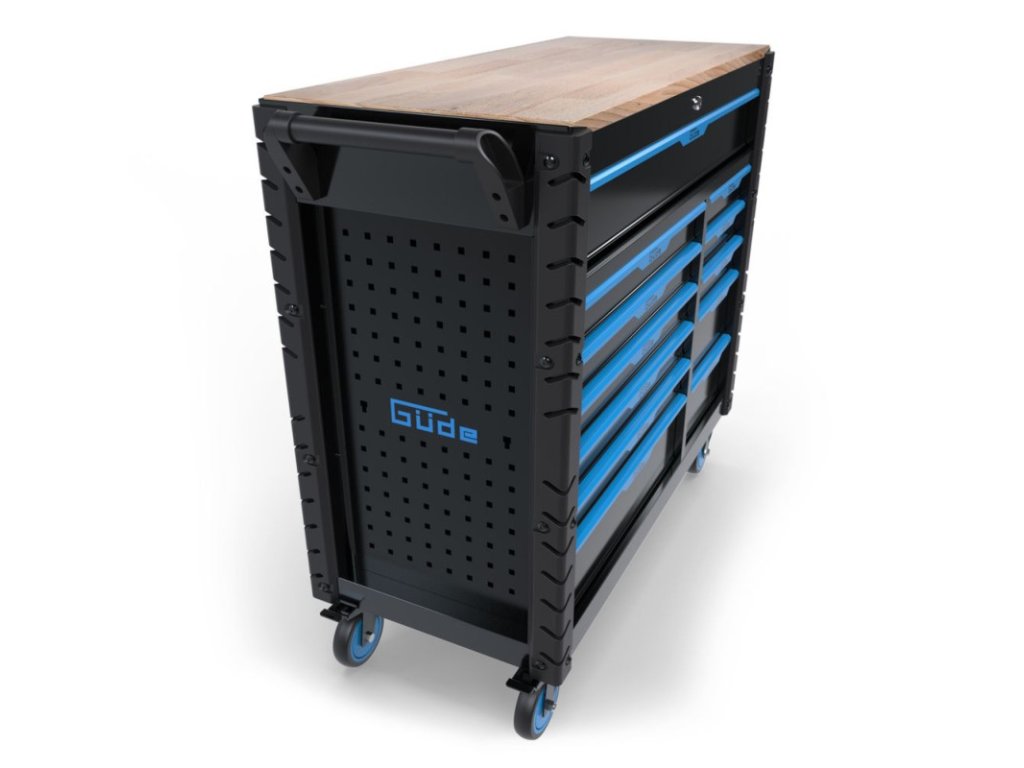Kombinácia mobilného pracovného stola a vozíka na náradie je praktická pre domácich majstrov a profesionálov, ktorých pracovisko nemusí byť nevyhnutne stacionárne. Extra veľký úložný priestor vďaka 12-tim zásuvkám rôznych veľkostí. Zásuvky s pogumovaným úchytom a plným vysúvaním, osadené na kvalitných guľôčkových ložiskách. Protišmykové alebo čalúnené podušky vo všetkých zásuvkách. Centrálne uzamykanie zásuviek s dvoma kľúčmi. Pevná a odolná pracovná doska z kaučukového dreva. Štyri veľké PVC kolieska pre vysokú flexibilitu premiestňovania. Dva kolieska s brzdou pre bezpečnosť. Perforované bočné steny na dodatočné zavesenie náradia. Pevná oceľová konštrukcia s povrchovou úpravou práškovaním. S ochranou hrán a praktickým držadlom na premiestňovanie. Držadlo na premiestňovanie a kolieska s brzdou môžu byť namontované na oboch stranách. Stôl sa dodáva zmontovaný (s výnimkou koliesok).Maximálna nosnosť: 400 kgŠírka pracovnej dosky: 1050 mmHĺbka pracovnej dosky: 480 mmHrúbka pracovnej dosky: 20 mmPracovná výška: 1000 mmVeľká zásuvka:Počet: 1 ksŠírka zásuvky: 920 mmVýška zásuvky: 120 mmHĺbka zásuvky: 420 mmNosnosť zásuvky: 30 kgStredná zásuvka:Počet: 6 ksŠírka zásuvky: 578 mmVýška zásuvky: 5 x 75 / 1 x 155 mmHĺbka zásuvky: 420 mmNosnosť zásuvky: 30 kgMalá zásuvka:Počet: 5 ksŠírka zásuvky: 315 mmVýška zásuvky: 3 x 75 / 2 x 155 mmHĺbka zásuvky: 420 mmNosnosť zásuvky: 30 kgPerforácia bočných stien: 10 x 10 mmRozostup otvorov bočných stien: 38 x 38 mmRozmery (ŠxHxV): 1125 x 480 x 1000 mmHmotnosť: 88,5 kg/93 kgDodatočné parametre