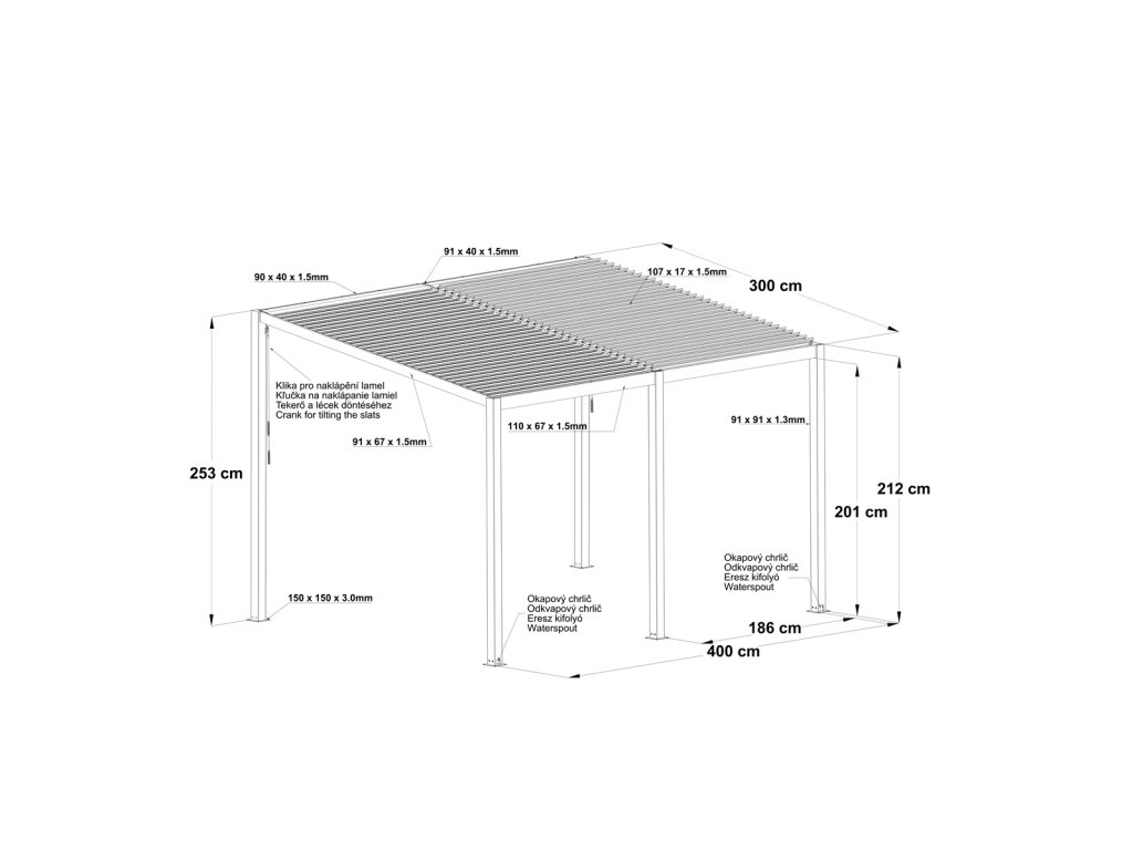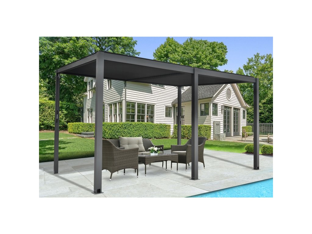 Moderní bioklimatická pergola RMBP 13 x 10 v elegantním antracitovém provedení je ideálním řešením pro stylové a funkční zastřešení venkovního posezení. Nabízí variabilní systém zastínění, který umožňuje regulovat množství světla i proudění vzduchu, takže si můžete naplno užívat pobyt venku v jakémkoliv počasí. Pergola má celkové rozměry 400 × 300 × 251 cm, což poskytuje dostatek prostoru pro pohodlné posezení i větší zahradní nábytek. Konstrukce je vyrobena z odolného hliníku o tloušťce 1,3–3,0 mm s povrchovou úpravou práškovým lakováním, což zajišťuje dlouhou životnost a vysokou odolnost vůči povětrnostním vlivům. Spoje a kotevní prvky jsou z nerezové oceli třídy 304, která vyniká pevností a odolností proti korozi. Střecha pergoly je tvořena 64 hliníkovými lamelami (louvre blades) a dvěma krycími díly. Lamely lze manuálně naklápět pomocí dvou ovládacích klik, což umožňuje plynule přecházet mezi otevřenou a uzavřenou střechou. Díky dvouzónovému systému střechy lze jednotlivé části otevírat a zavírat nezávisle na sobě – můžete si tak vychutnat sluneční paprsky na jedné straně, zatímco druhá část zůstává zastíněná. Celá konstrukce je voděodolná a dešťová voda je elegantně odváděna zabudovaným okapovým systémem, který ji svede přes nosníky a sloupy až k zemi. Kontaktní údaje výrobce / dovozce / zplnomocněného zástupce výrobce v EU: GARLAND distributor, s.r.o. Šturmova 1307, 50601 Jičín, Czech Republic email: garland@garland.czDodatočné parametre