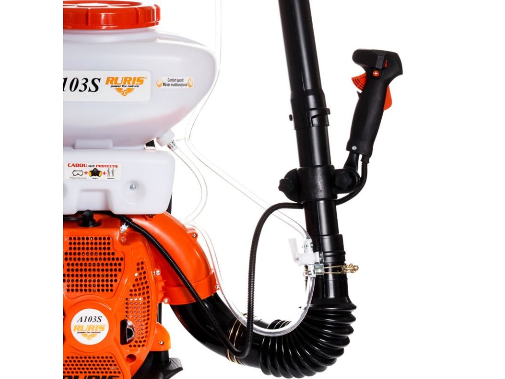 - RURIS A103S je vybavený deflektorovou trubicou, ktorá má v štandardnej výbave rotačný valec pre vytváranie špirálovitého lúča a teda postrek je prirodzený aplikáciou celkom 99% roztoku na celý povrch ovocia, listov, atď.