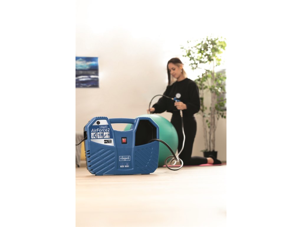 Kompresor Scheppach AIR FORCE 2 je praktický, skladný, lehký, výkonný a bohatě vybavený pomocník vhodný do každé domácnosti, chaty, karavanu nebo lodě. Díky velkému množství různých koncovek, silnému motoru a vysokému pracovnímu tlaku si hravě poradí s foukáním pneumatik motocyklů, kol, aut, terénních čtyřkolek, míčů, matrací, nafukovacích člunů, raftů apod. Veškeré příslušenství, včetně elektrického kabelu, 3 m tlakové hadice, pistole s manometrem a devíti různých koncovek je chytře ukryto uvnitř kompresoru, takže se Vám nic neztratí. Pohodlné madlo usnadní přenášení. Kompresor je vybavený nejmodernějším motorem s bezolejovou technologií. Kontrola oleje, jeho doplňování nebo výměna tak vůbec není potřeba a kompresor je vždy připravený odvést svoji práci. Jeho rozměry a váha pouhých 5,5 kg ho rovněž předurčují k využití při stanování, kempování a jiných outdoorových aktivitách.