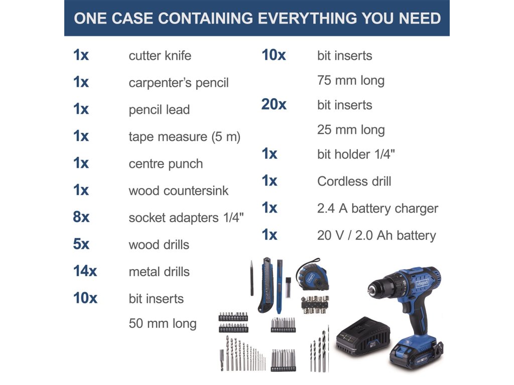 C-DTB74/1-X - 20 V aku set 2-rychlostního vrtacího šroubováku a 74 ks příslušenství S praktickou sadou Scheppach C-DTB74/1-X máte vždy po ruce vše potřebné pro běžné vrtací práce. Set obsahuje výkonný akumulátorový vrtací šroubovák, nabíječku, baterii a 74 dílnou sadu příslušenství, díky které zvládnete všechny práce doma, na zahradě, stavbě či na cestách. Díky točivému momentu až 50 Nm a 25 stupňům nastavení utahovací síly spolu s režimem vrtání zvládnete vše od jemných úkolů až po náročné projekty. V neposlední řadě disponuje i LED osvětlením a klipem na opasek. Lithium-iontová baterie o napětí 20 V a kapacitě 2,0 Ah nabízí dlouhou výdrž bez samovybíjení a paměťového efektu. Nabíječka 2,4 A s automatickým vypínáním a LED indikací zajišťuje bezpečné a efektivní nabíjení. Vše, včetně 74 kusů užitečného příslušenství, je uloženo v odolném transportním kufru, který šetří místo a umožňuje snadné přenášení. Konstrukce Samotná vrtačka je vybavena moderním uhlíkovým motorem zajišťující plynulý chod a dvourychlostní převodovkou a nastavitelnými otáčkami, což umožňuje přizpůsobit výkon konkrétnímu materiálu a aplikaci. Stroj je plně kompatibilní se všemi akumulátory a nabíječkami řady Scheppach IXES 20V, které nabízí maximální flexibilitu a pohodlí bez kabelů. Součásti balení: akumulátorový šroubovák 1x lithium-iontová baterie 20 V/2,0 Ah 1x nabíječka 2,4 A řezací nůž truhlářská tužka náhradní tuha svinovací metr (5 m) důlčík záhlubník na dřevo 8x nástrčné adaptéry 1/4" 5x vrták do dřeva 14x vrták na kov 10x bity (délka 50 mm) 10x bity (délka 75 mm) 20x bity (délka 25 mm) držák bitů 1/4" kufr Baterie a nabíječky pro 20 V aku systém IXES Kompletní nabídku naleznete v záložce Baterie a nabíječky. S bateriemi systému Sheppach 20V IXES je možné pohánět libovolný stroj z více než 30 různých modelů nářadí a zahradní techniky.Dodatočné parametre