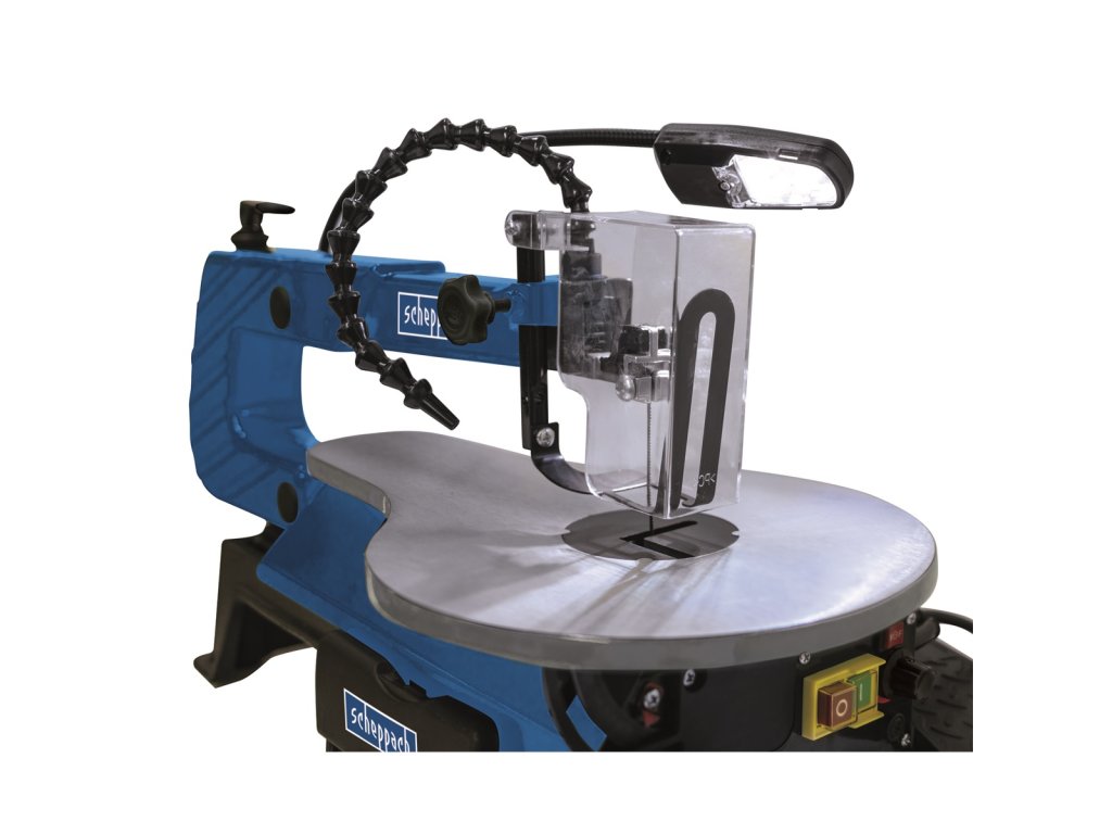 Lupínková pila Scheppach Deco-XLS je díky novému nožnímu ovladači velmi snadno ovladatelná i při řezání velmi složitých tvarů. Na stroji si nastavíte potřebné otáčky a lehkým tlakem na nožní pedál pak stroj jednoduše zapnete nebo vypnete, kdykoliv to potřebujete. Obě ruce tak máte po celý čas volné a můžete kontrolovat precizní posun obrobku při řezání. Pila je skvělým pomocníkem pro modeláře i domácí kutily. Dokáže vyřezat přesné a komplikované tvary ve dřevu, plastu, kovu, plexisklu a dalších materiálech. Základem je velmi silný motor s nastavitelnými otáčkami. Velmi pevné paralelní rameno a téměř bezvibrační uložení pilového plátku pak dovoluje, spolu se správně zvolenou rychlostí, provádět dokonale čisté řezy. Dokonalou vizuální kontrolu obrobku zajišťuje průhledný bezpečnostní kryt pilového plátku, nastavitelné pracovní LED osvětlení s odděleným vypínačem a systém odsávání pilin z řezné dráhy. Pracovní stolek je nastavitelný v úhlu až 45°. Výhodou je i systém rychlé a snadné výměny pilového listu pomocí rychloupínacího knoflíku a možnost namontovat na pilu pilový plátek jak s pojistným kolíkem, tak i s hladkým koncem. Pila Scheppach má i konektor na odsávání pilin odsavačem a montážní otvory v podstavci na pevné přichycení k pracovní desce.