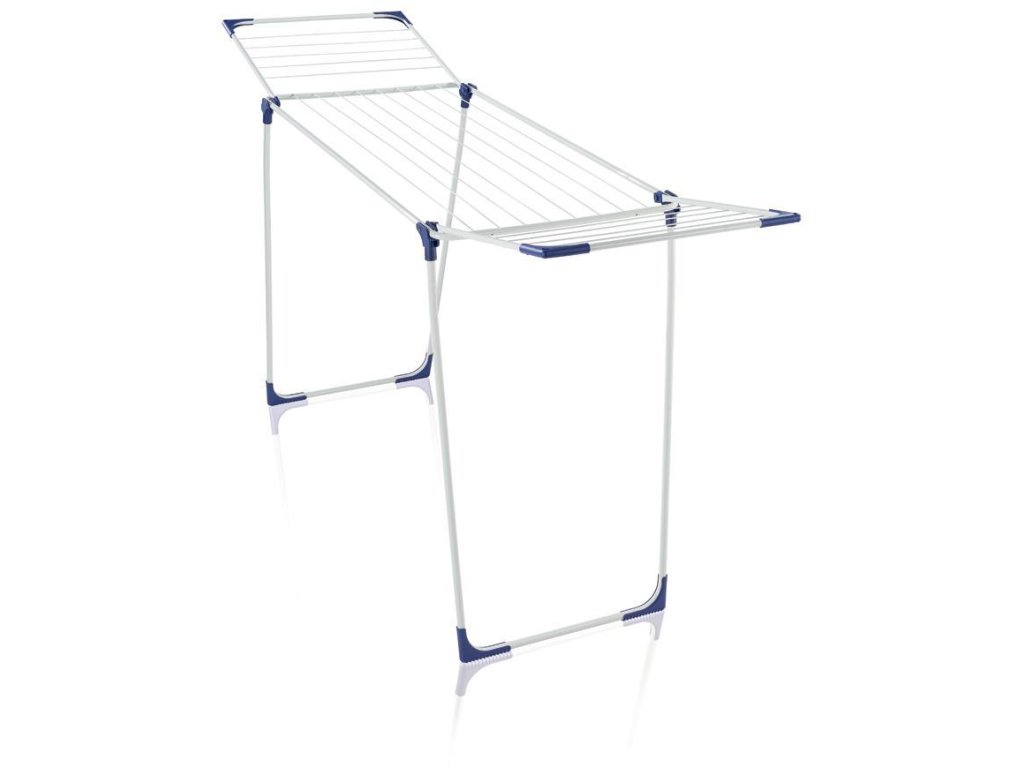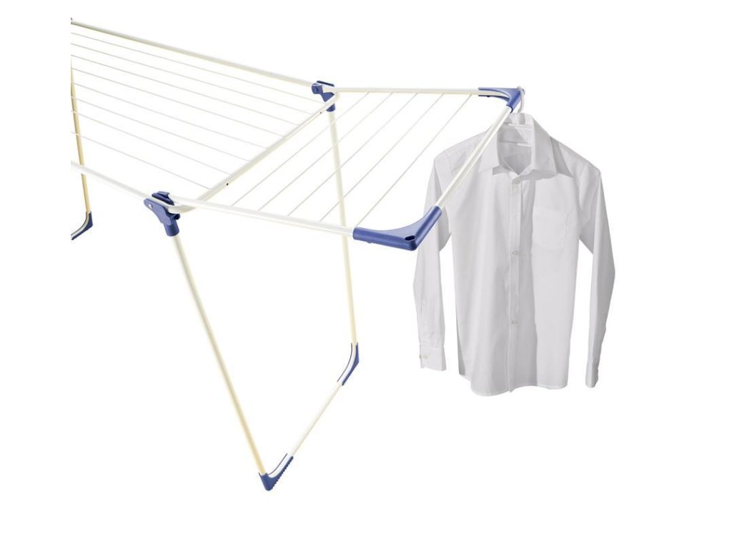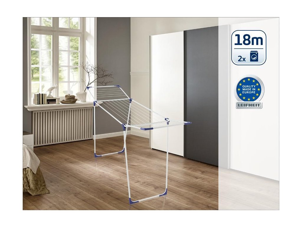 Stabilný sušiak na bielizeň s výklopnými bočnicami, ideálny pre vnútorné i vonkajšie použitie, 18 m sušiacej plochy = až 2 práčky bielizne, výška sklápacích bočníc 100 cm, možnosť zavesenia dlhých kusov odevov, 4 otvory na zavesenie ramienok, záruka 3 roky.